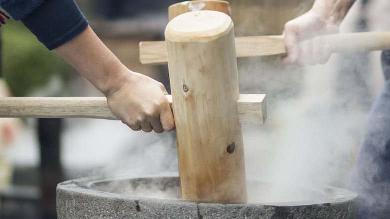 While mochi is known for having a simple flavor, the delightful rice treat isn't easy to make. To prepare mochi the traditional way, cooks start with a chewy variety of glutinous rice called mochigome. Cooks soak this ingredient overnight, then steam it, before starting a mochi-pounding process known as mochitsuki. During this process, two people work together, hammering the mochi dough with a large wooden mallet until it grows soft. One person works the hammer. Their partner turns the rice dough and adds water to the mixture.