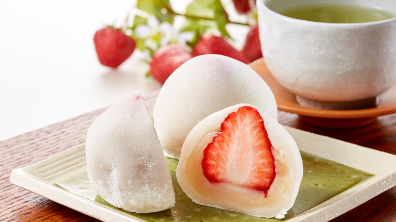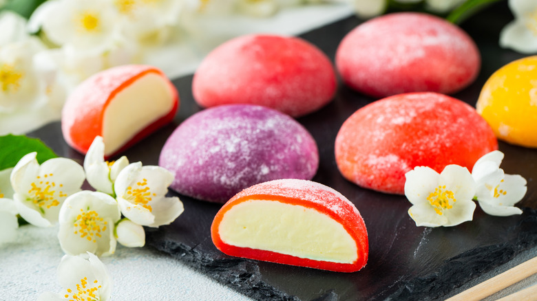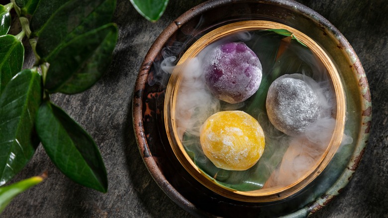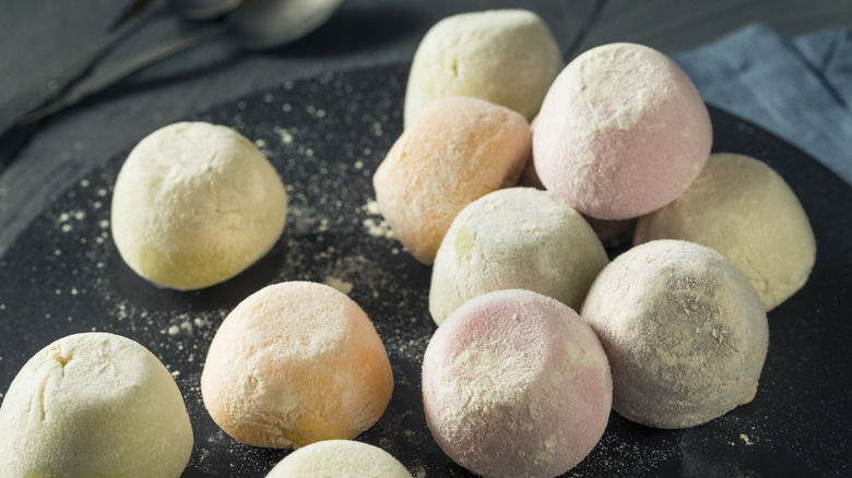 In 1981, the world of mochi changed forever. That year, the Korean food company Lotte released a brand of mochi-covered ice cream balls to the Japanese market. These delicious mochi ice cream snacks consisted of a rice dough exterior and a dairy-free rice milk interior. They were called yukimi daifuku, which means "snow-viewing dumplings," per SoraNews24. True to its name, the mochi was designed to be enjoyed while watching the snow fall.