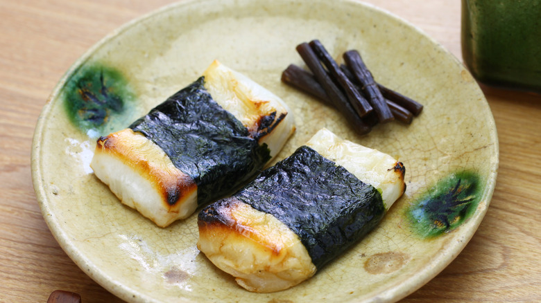 Despite mochi's international reputation as a dessert item, there are several types of savory mochi enjoyed in Japan. One of them is a soup called ozoni. Another, more pungent iteration of the treat, is called isobeyaki mochi. It involves deep umami flavors. To make, Japanese cooks start by grilling rice dough in a stovetop pan. Next, cooks flavor the mochi with soy sauce. Finally, the whole thing is wrapped in a piece of nori seaweed. Some people even like to add a touch of sugar, making the dish the perfect balance of sweet and salty.