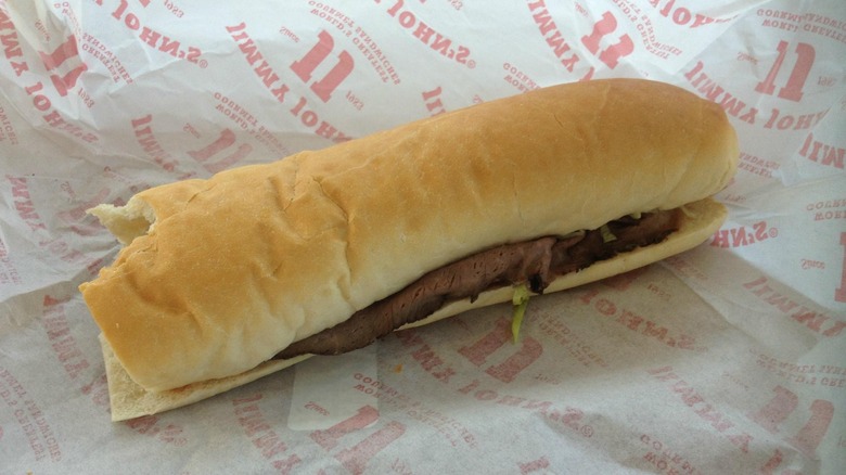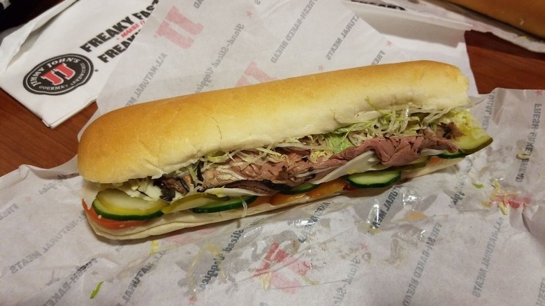 The simple roast beef sandwich at Jimmy John's is known as the #2 Big John. With deli meat, mayo, tomato and lettuce, it does have some health benefits (even if the roast beef isn't particularly lean), since it is lower in calories than other types of beef. It's also high in protein, lower in saturated fat and carbohydrates, and packed with iron.