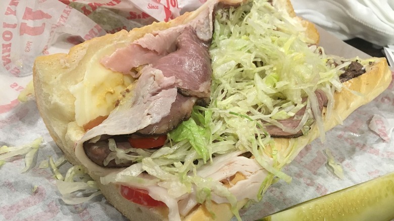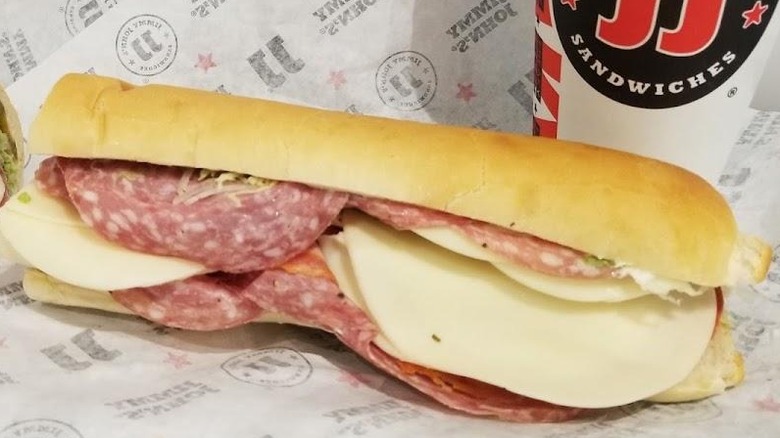 The Country Club is the #11 sandwich on the Jimmy John's menu. It comes with two types of hand-sliced deli meats, along with provolone. In addition to the smoked ham, turkey, and cheese, it also gets a slathering of mayo, tomato, and lettuce. To slim this sandwich down, lay off the mayo and get rid of some of the cheese.