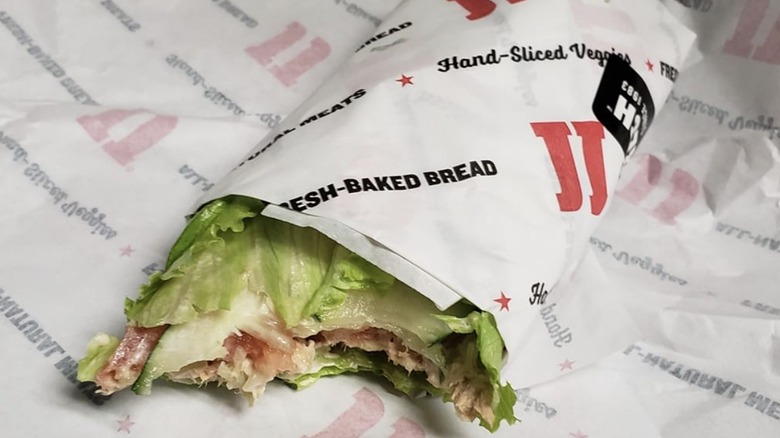 Exactly what's inside Jimmy John's tuna salad isn't completely clear. The company only stated that it is "made from scratch by hand" every day, along with the chain's oil and vinegar and Kickin' Ranch. It contains "real tuna fish, real Hellman's" mayonnaise," and "real fresh veggies" including celery. You can add extra lettuce, tomato, and cucumber on top for a more filling sandwich and red pepper flakes for a little kick.