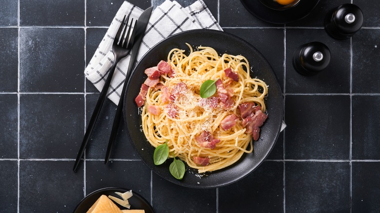 Rachael Ray says that the key to the best possible carbonara is to take your pan off the heat before adding the egg and cheese mixture. Following Ray's recipe, you'll want to finish assembling all the separate elements of your carbonara in one pan. That means that you'll start by cooking your guanciale in a pan that's big enough to hold the finished pasta. This is done over a medium heat until the fat is rendered. Meanwhile, the pasta cooks in the water, and the eggs, cheese, and pepper are assembled in another bowl.