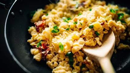 While there are a million different ideas to try in the kitchen when it comes to making scrambled eggs, we're gonna break down a few of the best techniques. The first secret to the softest, fluffiest eggs of your life is that it's all about how you treat them on the pan. When your eggs hit the skillet, using a wooden spoon is essential. This kitchen tool handles heat better than others and will be gentle on the fragile breakfast food. With wooden spoon in hand, stir the eggs often to allow air exposure, which is necessary for them to soften.