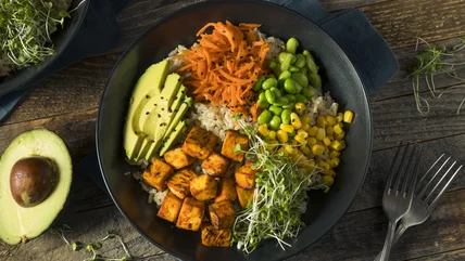 Now that you have everything ready to go, arrange your produce and proteins artfully. An easy and popular way to do it is to make neat rows or stripes around the center, like a clock, which you can stir up when it's time to eat. You can also try fanning out anything sliced, like avocado, grilled Portobello mushrooms, or sections of pineapple.