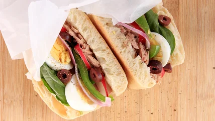 To ensure the bread properly soaks up the juices and oils, pan bagnats are meant to sit overnight. In addition to wrapping it in plastic and leaving it in the fridge, a cast iron or other heavy object is often placed on top of it. By the next morning, the sandwich will be perfectly soggy, or more accurately, "bathed." Just keep in mind that this process only works if you use a baguette or similar type of artisan bread. Otherwise, your pan bagnat will turn mushy, especially if you plan to weigh it down with a cast iron.