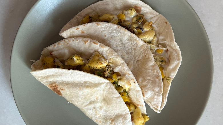 We drove through to pick up a few tacos, and the drive-thru attendant tried to warn us that they were too spicy — spoiler alert, they're not! The lime crema provides a nice amount of heat, though if you really like things spicy, you'll want to add some salsa or hot sauce. The eggs are probably pre-cooked, but they taste freshly scrambled, not rubbery. The street corn adds a light crunch, and the cheese was just enough without being overwhelming.