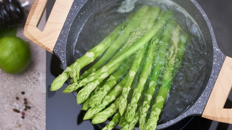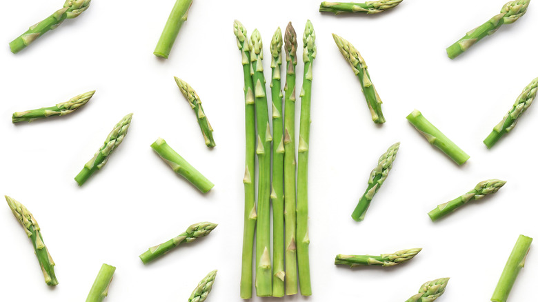 Spring has sprung, and with the emergence of vibrant crocus buds and the hum of vacuum cleaners ready for spring cleaning, asparagus lovers are ready to dine. Asparagus is at its best for a few weeks in spring, and those who love its distinctive, grassy flavor are enthusiastic to enjoy it in all its delicious iterations. Whether the tasty spears are steamed, roasted, shaved into a salad, or baked into a tart, there is nearly no limit to the way asparagus may be enjoyed. However, the whole spear isn't as delicious as the tender top part of the asparagus, which begs the question, what's the best way to cut asparagus?