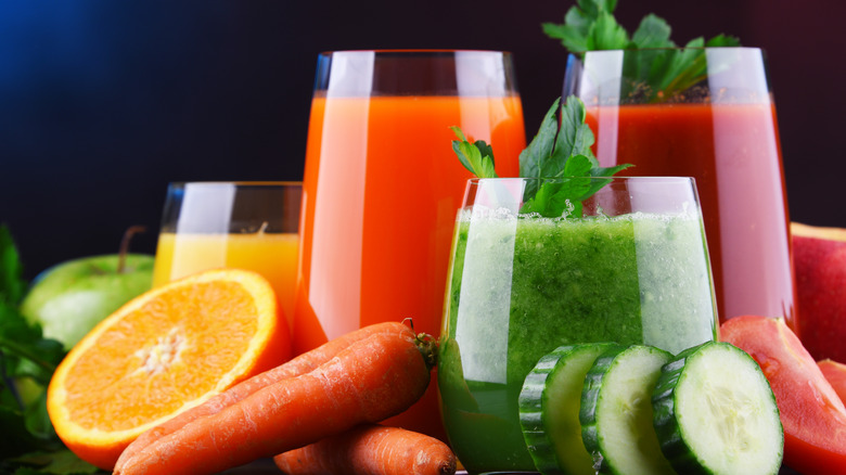 Kind of like when you eat too much too fast when you drink juice too quickly, "you swallow more air," as stated by Northwestern Medicine. Similarly, if you drink your juice — or any beverage for that matter — with a straw, that may also contribute to bloating. Registered dietitian Sheila Mulhern told Adventist HealthCare, when you take that first sip, it "introduces air into the gastrointestinal tract, which in turn can cause gas and bloating." Rather than sipping your juice through a straw or chugging it in a few seconds, try sitting down to sip and savor it over several minutes. The act of slowing down while you drink your juice can also help relax your mind and body, encouraging your stomach to properly digest the liquid and your tastebuds to thoroughly enjoy all the flavors your juice has to offer.