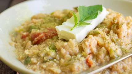 Once you have trahana, there are many different recipes in which it can be used, such as a porridge with tomatoes and feta, a soup simmered with lemon and olive oil, or a Greek chicken one-pan dinner. Many recipes are easy to adapt and make your own, for example, by adding vegetables, protein, or other seasonings.