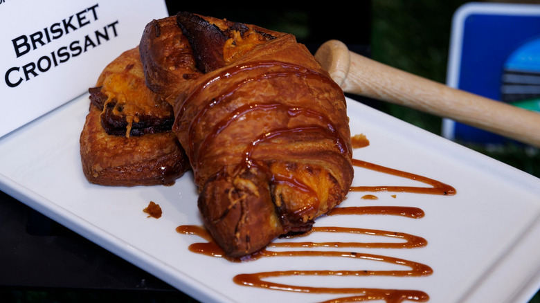 If state meat was an actual honorary designation, there's no question that Texas would immediately claim brisket. This mouthwatering smoky beef cut always goes well with a carbohydrate companion, but it's typically served within a sandwich or accompanied by a biscuit or slice of toast. For the 2023 baseball season, Globe Life Field's spin on the pairing of brisket and bread looked across the Atlantic for inspiration and ran with croissants, and we say, "oui, oui" to that.