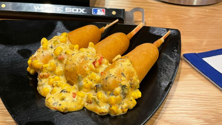 Chicago White Sox' Elote Corn Dog reaches exponential levels of starchy goodness. It's served alongside a sweet and mildly spicy dip that's an appealing bright shock to the eyes and is chock full of yellow-hued kernels served alongside peppers and herbs. Hang onto the leash because that dog you have in your hands is more than ready to take a swim in it. You can find the Elote Corn Dog at Guaranteed Rate Field in sections 140 and 544.