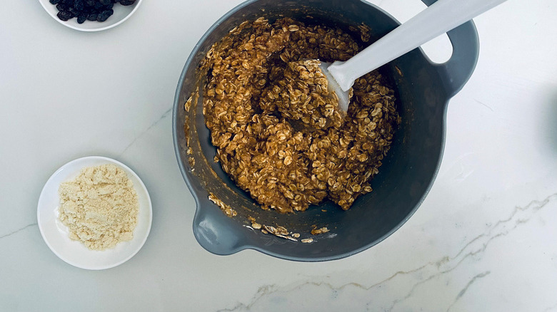 Set the oven to 350 F. As it heats up, you'll have plenty of time to make the cookie dough. Start by mixing the "wets": applesauce, almond butter, maple syrup, and almond extract. Now add the "dries": the oats, cinnamon, baking powder, baking soda, and salt. Stir just enough to mix everything together, then fold in the almond flour followed by the raisins.