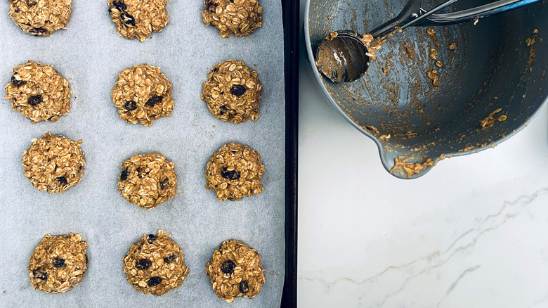 - Scoop 15 cookies (approximately ¼ cup each) and arrange them on the sheet pan.