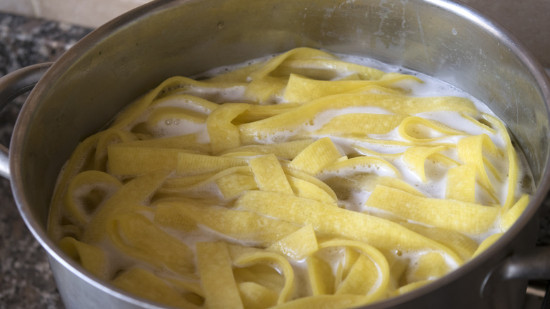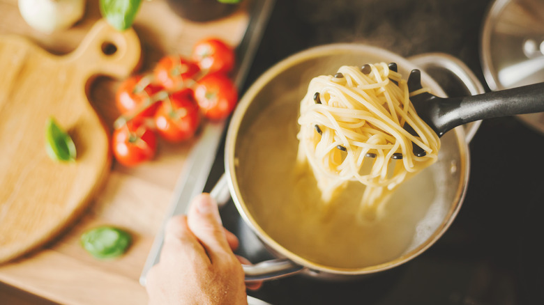Pasta water — or the water left over after you perfectly cook pasta — is often just poured down the drain when you strain the pasta, but you shouldn't waste it. Once you see why, you'll be thrilled to hang on to your pasta water, especially in this economy. But why has an ingredient that has been around for centuries started trending recently? Pasta water is having a moment, and it's easy to see why.