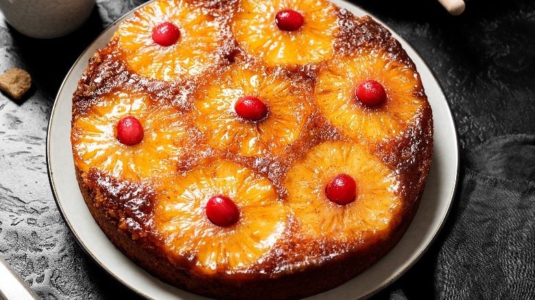 The prettiest pineapple upside-down cakes used ring slices instead of chunks. These get mixed and heated with butter and brown sugar before the batter is added; maraschino cherries and nuts can be added for color and texture. After the cake is fully baked, it gets removed from the pan while slightly warm and flipped over to reveal the pineapples. It's an easy trick with a big payoff.