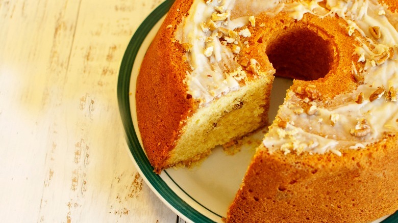 This yummy bundt cake uses a boxed yellow mix, pecans, and cinnamon sugar. The original recipe added sour cream for moistness and topped the batter with a streusel made from the nuts. And once it was baked and cooled, a thick layer of canned Duncan Hines vanilla frosting was the crowning finish.