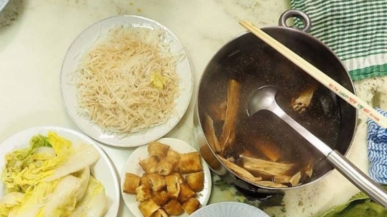 Many Japanese meals consist of a variety of communal dishes. You serve yourself, but you should never use your own chopsticks to do so. You may find dedicated serving chopsticks provided next to — or resting on top of — hotpots or other shared dishes. You can use these chopsticks to move food to your own bowl.