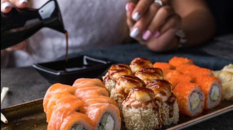 Many sushi rolls, such as maki, are designed to be dipped into soy. This adds a rich, salty, umami flavor that complements the fish, meat, eggs, rice, and seaweed. However, you'll find some more elaborate sushi rolls have already been marinated, so you don't need to dip these in soy sauce. Again, you can avoid adding more soy to pre-drizzled rolls to enjoy the flavors the chef intended.