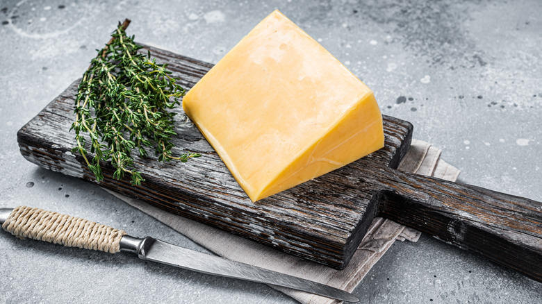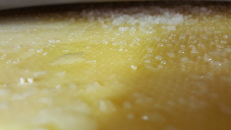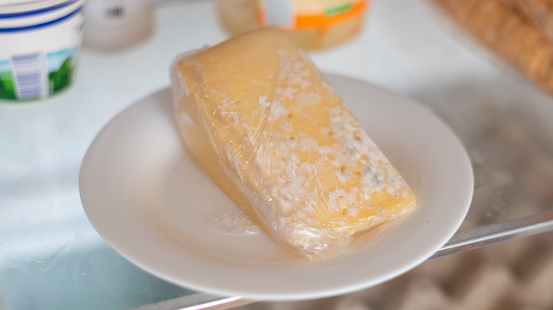 Here's a scenario that many of you have undoubtedly encountered. You're hankering for a hunk of cheese, so you peep into the fridge and see a block of it covered in white speckles. This happens to many different kinds of cheese, but it is most noticeable on cheddar thanks to it being orange rather than the white hue common to most cheeses. The natural assumption to make here is that the cheese is growing mold, so you have no choice but to toss it away.