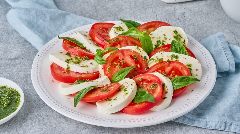 If you want to do the Italians justice, don't skimp on the ingredients. We recommend purchasing the creamiest mozzarella, juiciest heirloom tomatoes, and the finest extra virgin olive oil you can find. When it comes to basil, don't chop it up. Doing so can cause the leaves to lose their texture quickly. For a more playful presentation, consider using tiny mozzarella balls and cherry tomatoes. This variation can add a touch of whimsy to this classic dish. To make things even better, the ingredients in Caprese salad can be easily adapted to other beloved Italian dishes. Don't be afraid to use them in your next pizza, pasta, or panini.