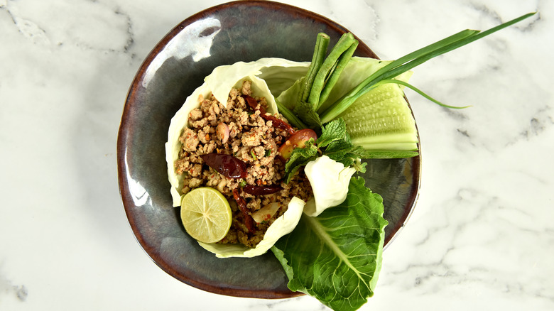 But that's just the beginning. This salad is also made with toasted fragrant rice, kaffir lime leaves, and the spice galangal. Meanwhile, the addition of palm sugar mellows things up a bit. Finally, you'll want to add a generous squeeze of lime juice to balance the sweetness. It's worth noting that larb gai is best eaten immediately, so be sure to dig in while it's still fresh.