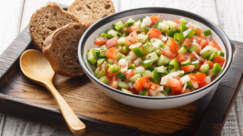 Variations of pipirrana salad abound in Spain's southern coastline, with seafood such as tuna, cod, or shrimp complementing the classic tomato base. In some Spanish regions, pipirrana is often scooped out of the bowl using pieces of bread. If you're making pipirrana at home, try to remove seeds from your tomatoes and cucumbers before serving.