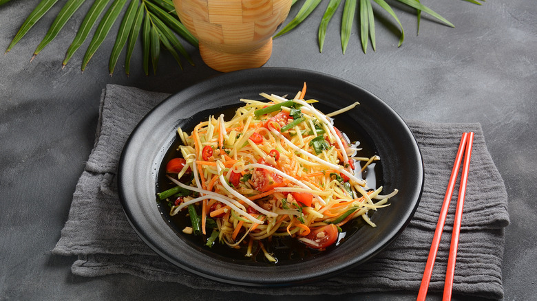 But the real showstopper is crisp and refreshing green papaya. This is the salad's main ingredient and it adds an irresistible crunch to every bite. Several ingredients — excluding the green papaya, long beans, peanuts, and tomatoes — are usually tossed into a mortar and crushed into a bold-tasting paste that gives the salad its distinctive flavor. In some preparations, cooks add some shredded carrots for extra color and texture. The secret to success is avoiding overripe papaya. You don't want the fruit to be too soft, as its crunchiness makes this dish.