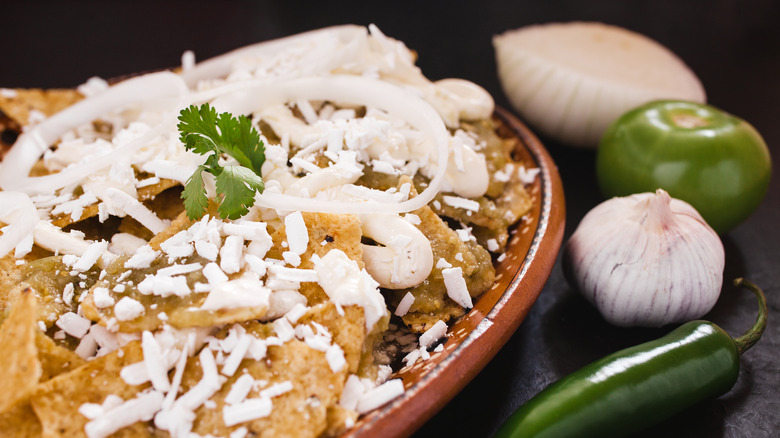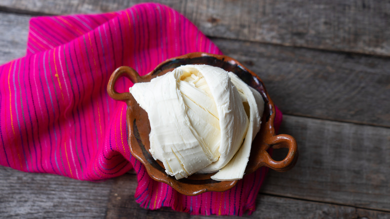 Oaxaca cheese is a semi-soft, rindless cheese that comes from the city of Oaxaca in Mexico. It's a supple, stretchy cheese that forms in ribbons that are wound into a ball before selling. If it sounds a lot like mozzarella, you're not wrong — it has a similar "string cheese" quality. It's considered to be a member of the pasta filata or "spun paste" category of cheeses. These cheeses are defined by the way they are made, with the curds being stretched in hot water before being formed into their final shape. The end result is a cheese that expands, stretches, and melts perfectly.