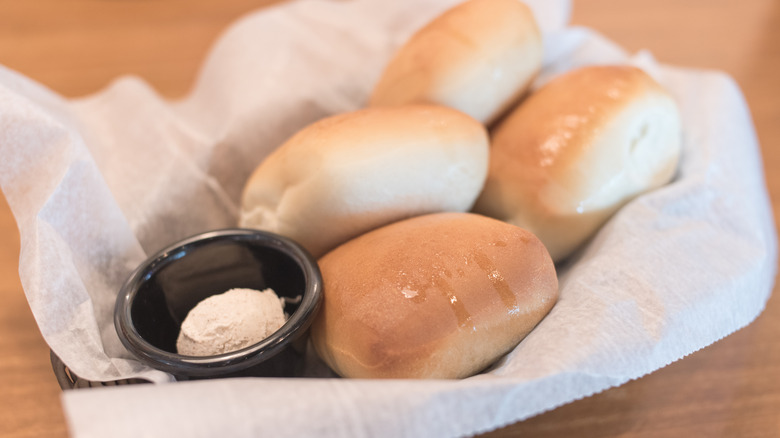 Other users chimed in that it's also possible to acquire frozen rolls, which last longer than the fresh ones. However, it typically depends on the establishment and the time of the year. Some locations offer frozen rolls around the holidays, while others don't offer them at all. You can determine whether your Texas Roadhouse location does by calling the restaurant to inquire about their frozen bread roll policy. And if you're curious about why these bread rolls are so beloved by patrons, the secret is in the preparation.