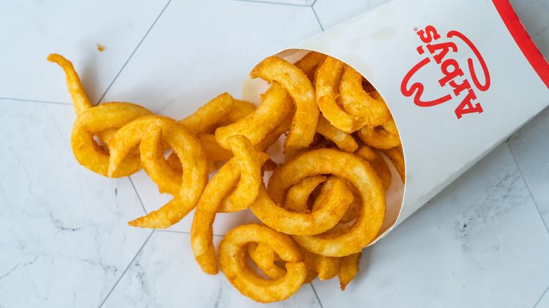 Curly fries are also high in carbohydrates, ranging from 29 grams for the snack size order, and 77 grams for the large. These simple carbs will spike your hunger signals, which can cause accidental overeating. The fries are also high in fat, with a large order delivering 35 grams.