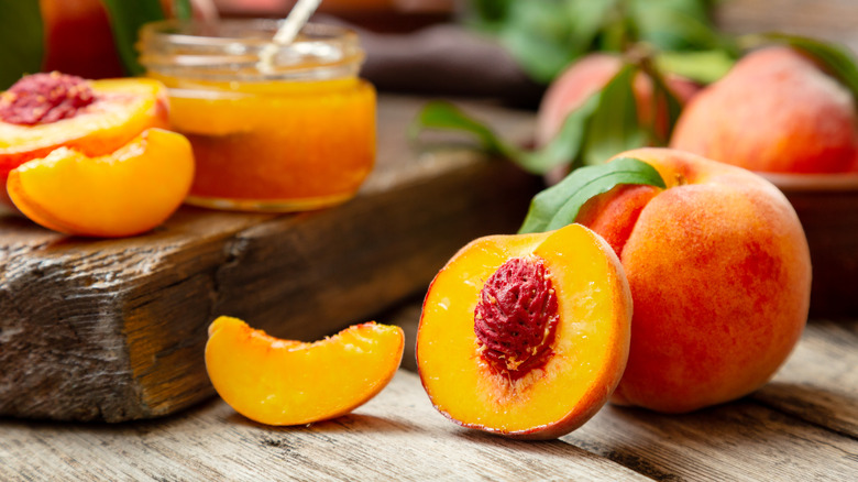 Peaches and apricots are both members of the Rosaceae family, but that's where the important similarities end. As Healthline explains, peaches are members of the Prunus persica species, while the most common type of apricot belongs to Prunus armeniaca. As a result, the two fruits differ in size, texture, and flavor.