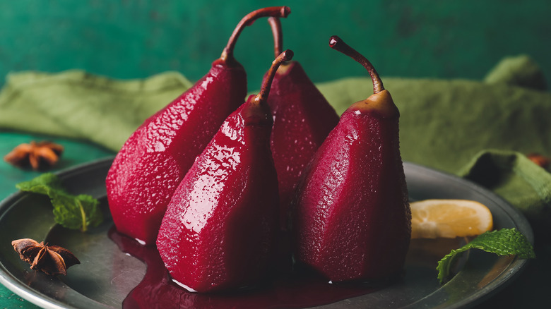 Poached pears are a French delicacy that originated in the wine regions of Lyon and Burgundy. Traditionally, this specialty involved poaching some underripe pears with local wines and plenty of spices as a way to mask the fruits' bitter flavors and bring out their inner sugars. These days, however, you can get more creative with this recipe, selecting riper, sweeter pears or even mixing up the ingredients. Ina Garten, for example, recommends experimenting with different varieties of poaching wine.