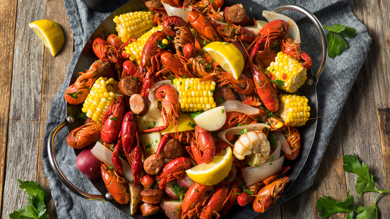 Crawfish are ordered by the pound, and in places like Louisiana, the vegetables in the crawfish boil (also called the Lagniappe) are eaten with the crawdads to serve as filler since it usually takes a lot of crawfish to make a satisfying meal. This is similar to a seafood boil but spicier. Those potatoes and corn ears can add up in calories, though, so if you are trying to stick to a healthy diet, you will want to monitor how many of them you eat.