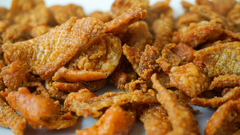 As you shred the chicken apart, you're probably pulling off all of the skin that's still on the meat. Truth be told, you probably wouldn't want to eat the skin the way it looks now — flabby, oily, chewy, like balling up a piece of rubber and soaking it in chicken grease. While it's not an appetizing treat in this state, you can use it to make a delicious and easy snack that's similar to potato chips or pork rinds.