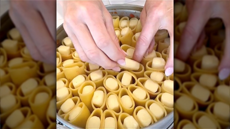 One of Rothfuss' go-to items for her self-quoted "Italian" TikTok dishes is string cheese, although many beg to differ over this household ingredient. One video shows Rothfuss dicing up a loaf of bread before stuffing the unusual "pizza" with cheese sticks, pepperoni, and marinara; however, the most unwonted — and unwanted — Italian dish involving an excessive amount of cheese sticks is Rothfuss' honeycomb pasta.