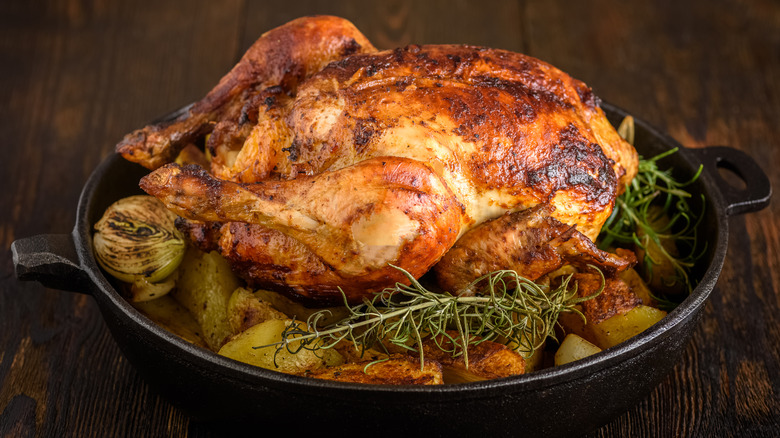 The once mundane roast chicken has been transformed to become a staple in American restaurants and cuisine, and for a good reason. It's easy to make, incredibly versatile, and packed full of flavor. Once you've cooked the perfect roast chicken, however, reheating it can be a bit tricky. It might be second nature to just throw it in the microwave or oven, creating a bland, dehydrated, and otherwise less enjoyable meal. Did you know that reheating roast chicken on the stovetop can actually be the best way to preserve its juicy tenderness and delicious flavor?