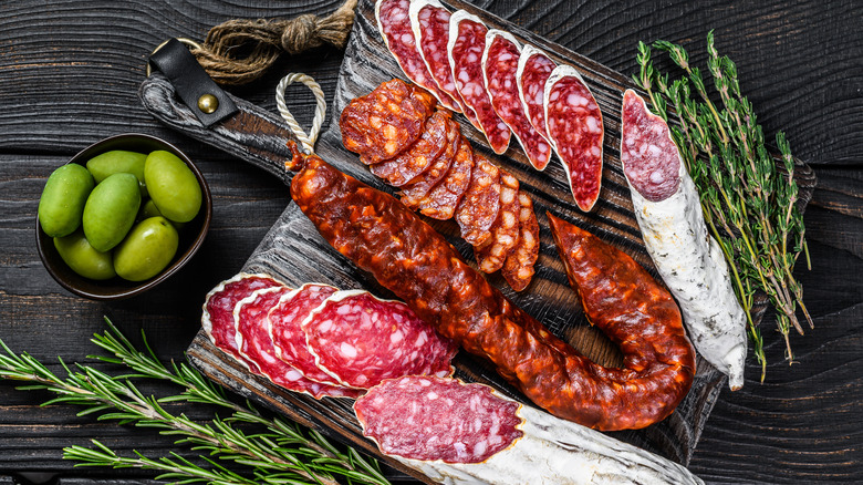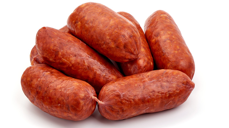 The core ingredients for both Mexican and Spanish chorizo are pork, although there are instances where other proteins are used). But this is where the similarity ends. Mexican chorizo is shorter and stumpier looking and made with fresh (i.e. raw) or uncooked ground pork. Spanish chorizo is longer, uses chopped meat, and — very importantly — is cured, similar to a salami. This means you need to cook the Mexican chorizo links before eating it. The meat can also be removed from the casing and used in place of ground pork for chili or burgers. In comparison, the Spanish chorizo can be sliced and eaten as-is — there is no cooking required.