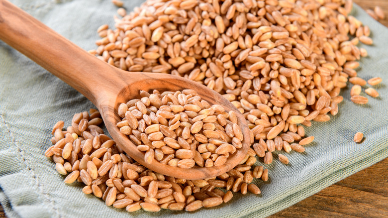 Maria Speck, who wrote a book on whole-grain recipes, shared with NPR that farro's popularity in the U.S. likely "got ignited by our passion for Italian food." While the grain was first discovered in Mesopotamia, it is now grown in Tuscany, Umbria, Marche, and Abruzzo. Farro consists of three types of grains: Farro piccolo (einkorn), farro medio (emmer), and farro grande (spelt). The U.S. prefers using emmer, a brown, tough, nutty grain that is well-liked by Italians. Einkorn, the oldest of the three types, is an uncommon find that is yellow, sweet, nutty, and an excellent addition to desserts such as banana bread, cookies, or muffins. Like Einkorn, spelt offers a sweet, nutty taste, but is a mild brown color and has less protein but more gluten. Spelt makes a good addition to dishes like risotto or whole-grain pancakes.