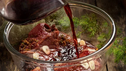 Wine is one of the best alcohols to use when marinating meat because of the acidity of different wine varieties. According to Science of Cooking, there are three types of acids perceived within winemaking that give certain flavors. Malic gives off the taste of green apples, lactic which gives a creamier mouthfeel and an oaky flavor, and tartaric which is more or less bitter. The acidity of wine breaks down the meat tissue and adheres the flavors of the marinade into the meat. Because of this, it's important to keep in mind how these will interact with the chosen meat proteins.