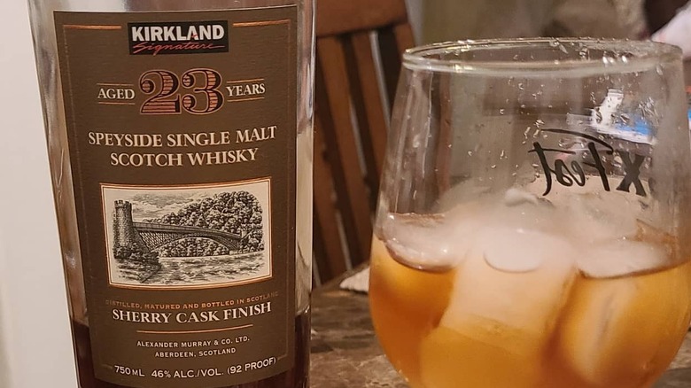 Kirkland Signature Speyside Sherry Finish Single Malt Scotch pretty much tastes the way it smells. There are elements of leather, vanilla, and malt. The Whiskey Jug gave it a favorable B+ rating. Tomodera Whisky Reviewer found notes of fruit, salt, coffee, and peanut brittle with a finish that whispers apple, clovers, and ginger. While it might not taste as aged as the label says it is, the website still called it a "solid sherried dram." The reviewer also noted that it "would be good as a neat pour at a bar, but it's not so expensive that you'd be sad using it in a higher-end cocktail."