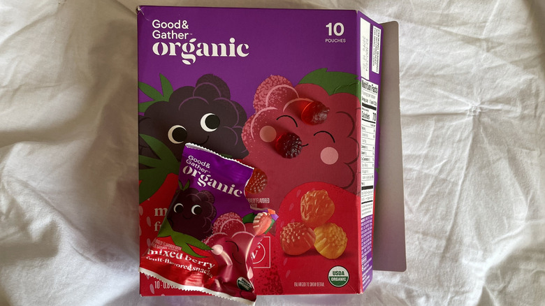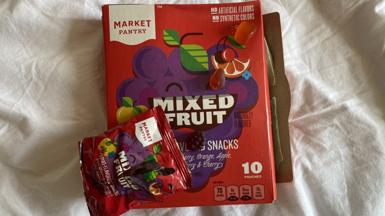 Each pouch rounds out to 70 calories, has 90 milligrams of vitamin C, and features no synthetic dyes. The brand's fruit snacks do, however, have 13 grams of added sugar and a practically nonexistent taste. We tried the mixed berry variation which offers five flavors: grape, orange, cherry, apple, and blue raspberry. Both the grape and apple gummies had no fruit-like flavor at all, the orange tasted somewhat like Sunny D, the blue raspberry had a reminiscence of the blue-like taste typical for the popular artificial flavor, and the cherry featured the smallest whiff of cherry-like flavor. Needless to say, while Market Pantry's nutritional value and price leave Good and Gather in the dust, the Target brand's taste leaves it on the lower end of the fruit snack brand scale.
