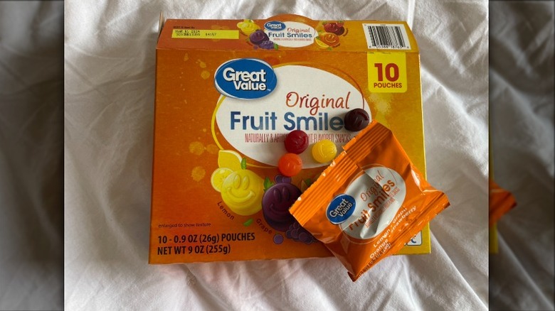 At $2.97 per 10 pouches, Walmart's Great Value Fruit Smiles are one of the cheapest fruit snacks on the list. However, they are also the highest in calories and filled with the most synthetic ingredients. Coming in at 90 calories per package, Great Value Fruit Smiles contains four different types of food dye: red 40, yellow 6, yellow 5, and blue 1. These treats are also far from allergy friendly as they have the potential to contain traces of nuts and milk. On top of that, their taste is not at all as fruity and fun as the fruit snacks' friendly smiles suggest. An original pack of this snack (Walmart also sells a tangy variety) includes strawberry, orange, lemon, and grape-flavored gummies. All four variations feature a chemical-like taste and an almost powdery texture. So although the snack does offer 60 milligrams of vitamin C per serving, its taste and ingredients make it the lowest-ranked fruit snack brand on the totem poll.