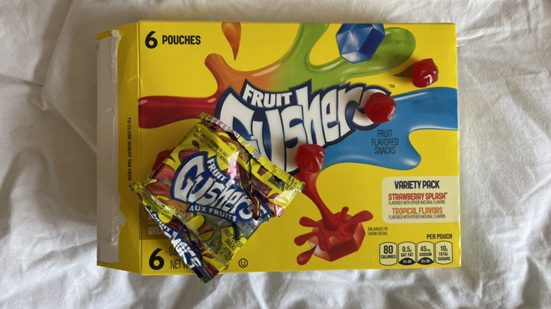 The variety pack we tried comes with two different flavors — tropical fruit, and strawberry splash. In terms of taste, both treats packed a flavor punch at first bite but quickly faded from tasting like fruit snacks to something akin to chemical-like gum. And as far as overall gushiness goes, tropical fruit was very lackluster, containing a small amount of juice inside its pieces. Strawberry splash had a better gush factor, but both treats also tended to stick to each other in their packages. With no nutritional value, a lackluster taste, and a terrible value for your money, Gushers is the lowest-ranked General Mills fruit snack on the list and the second-worst overall fruit-like treat.