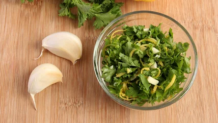 Simply take fresh parsley and garlic and chop until fine. You want a nice, rustic texture, but you don't want the parsley and garlic to become pulverized. Place chopped parsley and garlic in a bowl and add lemon zest, salt, and pepper. To ensure the different flavors fuse together beautifully, crush the ingredients with the back of a spoon while they're in the bowl. You can then add the mixture to dishes or incorporate a small portion of olive oil and use it as a marinade. Now that you're a bona fide gremolata master, the next step is to decide how to use the condiment.