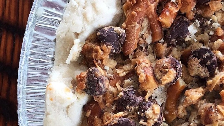 As soon as you learn all the ingredients that go into Texas Trash Pie, you'll understand how this one-of-a-kind dessert earned such an unusual name. You're essentially taking a few handfuls of all your favorite snacks and tossing them into a pie crust. The filling is made from equal parts pecans, chocolate chips, caramel bits, crushed-up pretzels, graham cracker crumbs, and shredded coconut. All of those treats are then mixed with butter and condensed milk to form a thick medley of salty and sweet flavors. This is all packed down into a pre-formed pie crust and baked until golden brown.