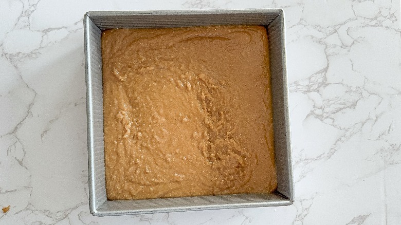 - Pour into an 8 x 8-inch baking dish that has been sprayed with nonstick cooking spray. Spread evenly.