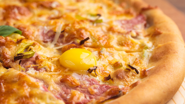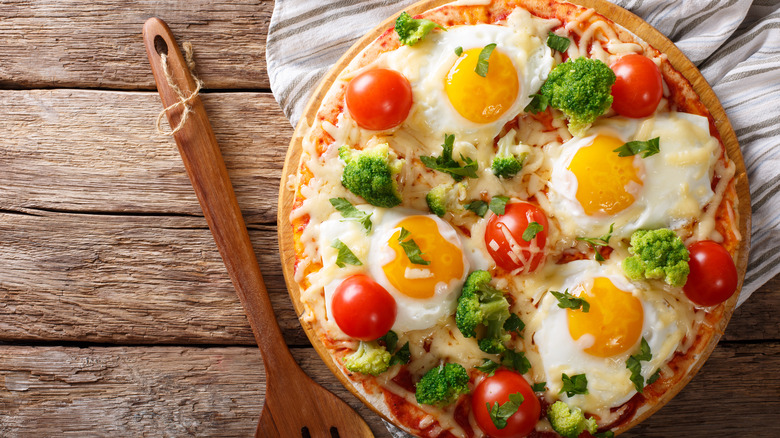 Keep your oven temperature in mind as well. There are lots of ways to elevate a frozen pizza, including baking it at a higher temperature than the directions to get a really crispy crust that's chewy inside — usually around 500 degrees Fahrenheit. Keep in mind that this high temp will cook your eggs faster, and might cause a little charring, so wait a little longer before putting the eggs in the oven. This is also true if you cook your pizza on a grill, as the inside with the lid down can reach temperatures of 550 degrees Fahrenheit.