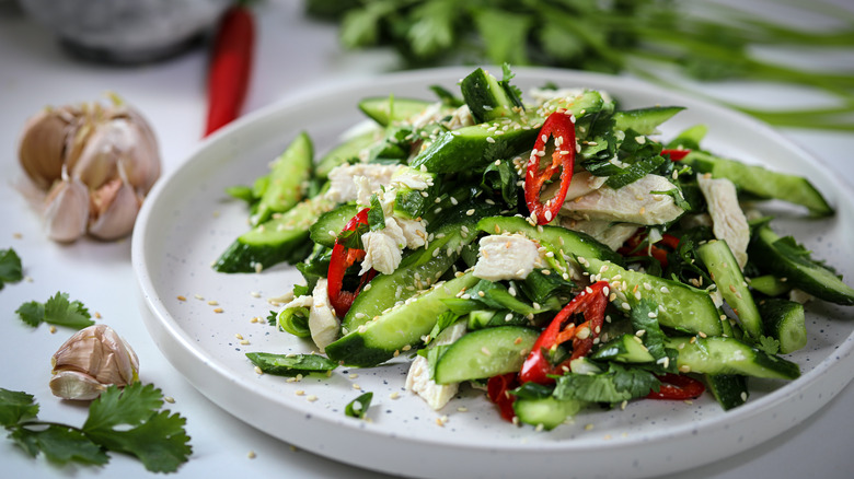 While tiger salad might be a Chinese dish, the concept of an herb salad is not limited to just one style of cuisine. Why can't a plate of celery, cucumbers, or green pepper combined with cilantro, mint, or parsley be dressed with some olive oil and some red pepper flakes? In the end, herbs can be more than just a finishing garnish. Put them as the star of the plate with a herb salad.