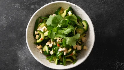 Although recipes and ingredients vary, generally the dish includes an herb, a crunchy textural component, and a bold seasoning. The herb is often cilantro, but it could be swapped for another leafy herb, like mint or basil. For the crunch, the ingredients are often celery, green pepper, cucumber, or another raw green vegetable. Lastly, the seasoning can come from a variety of sources. Whether it is a few red pepper flakes, a squirt of sriracha, or even a dollop of chili crunch, almost anything can be used to bring a touch of heat to the other bright flavors.